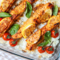 Place the salmon fillets on top of the rice, add the cherry tomatoes and basil leaves, then sprinkle with chili flakes.