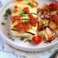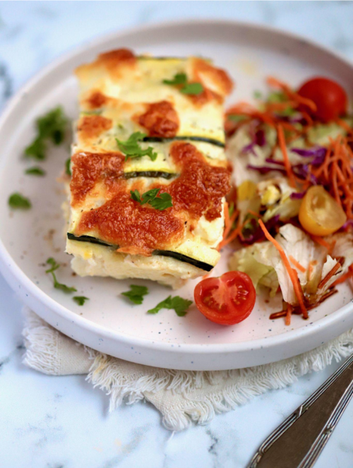 Place half of the creamy sausage mixture into the base of an 8x8” (20x20cm) baking dish. Arrange half the zucchini slices on top, then cover the zucchini with half the scrambled egg mixture. Top with half the shredded mozzarella cheese. Repeat this layering process, with the remaining sausage, zucchini, egg and cheese. Press down on the layers to flatten.