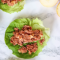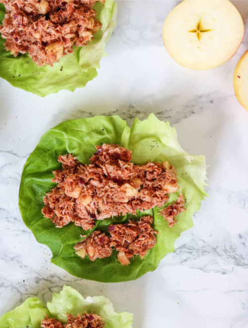 Spread the tuna over the 8 lettuce leaves and serve as wraps.